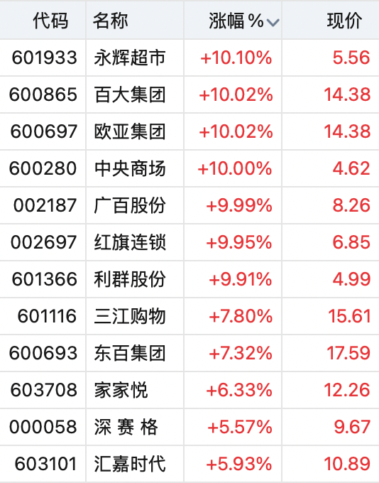 零售板块方面,永辉超市、百大集团、欧亚集团、中央商场等涨停,其中百大集团4连板。