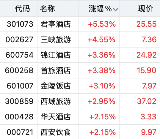 旅游及酒店板块方面,君亭酒店涨超5%,三峡旅游、锦江酒店、首旅酒店、金陵饭店等跟涨。