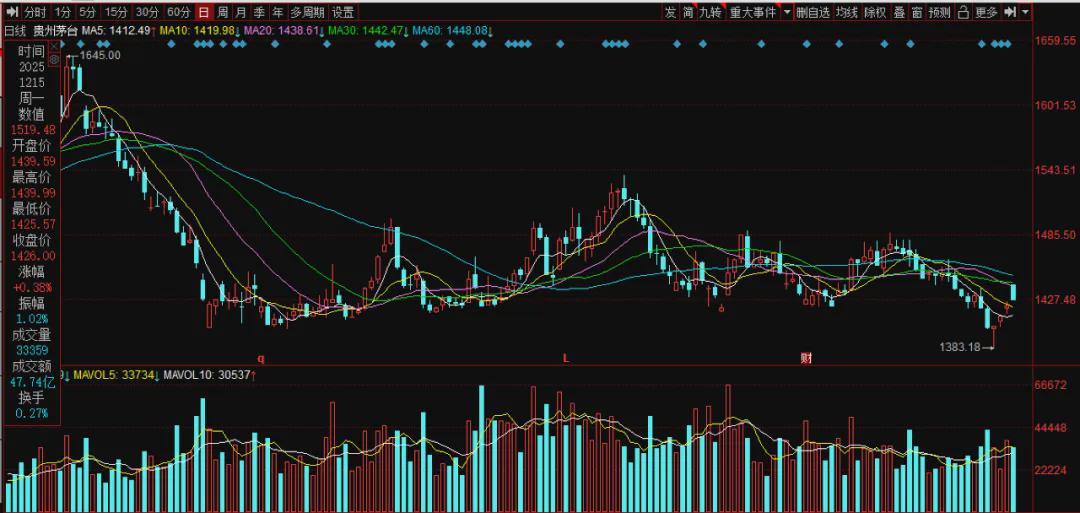 ▲飞天茅台批价跌破1499元后茅台股价表现,图源同花顺