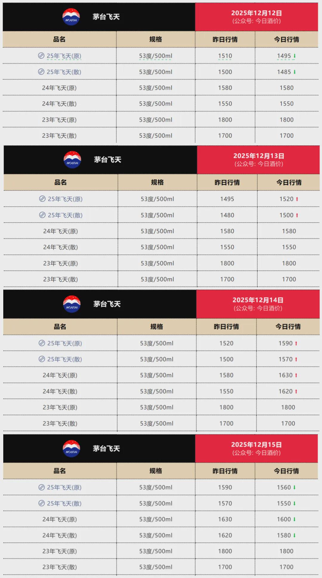在随后两天时间里,飞天茅台批价大幅反弹,单日内的批发价格甚至跳涨4次,12月14日,2025年飞天茅台散瓶酒的批价已回升至1570元/瓶,原箱酒的批价回升至1590元/瓶。