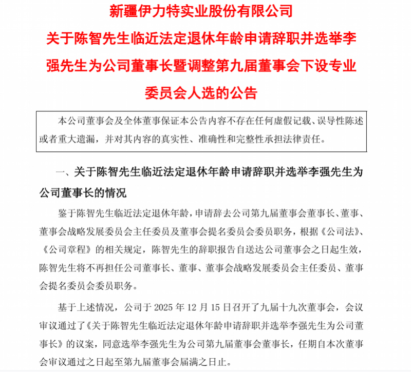 12月15日,伊力特公告称,因临近法定退休年龄,陈智辞去公司董事长、董事等全部职务。同日,董事会选举原党委副书记、总经理李强为新任董事长。这次看似常规的新老交替,发生在伊力特上市以来首次出现单季度亏损、营收净利润连续下滑、多项业绩目标未能达成的特殊时期,因而格外引人注目。