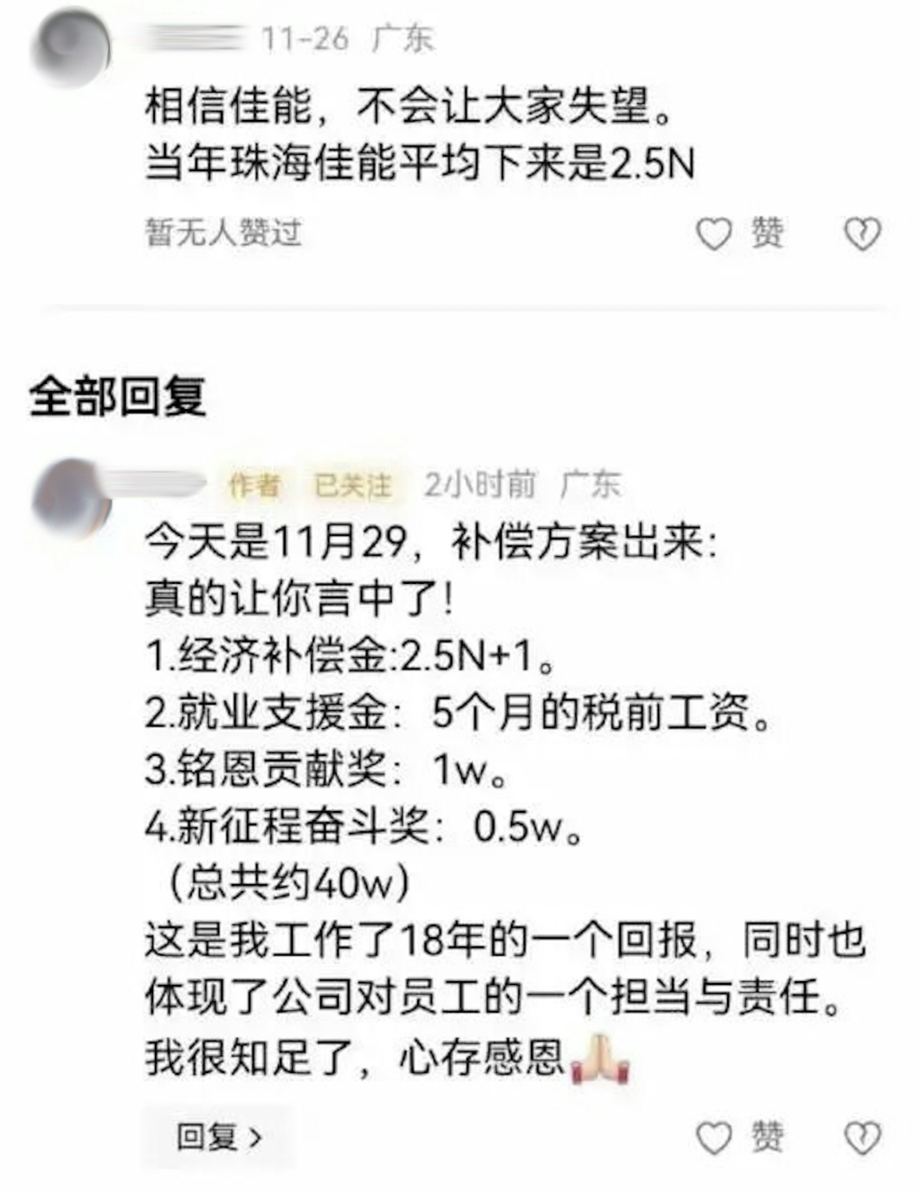 11月21日,在广东中山经营了24年的佳能激光打印机工厂正式关闭,千余名员工被裁。有自称工作18年的员工在社交媒体上分享自己拿到的补偿:包括2.5n+1的经济补偿金、就业支援金、铭恩贡献奖、新征程奋斗奖,总计40万。还有人说,员工们收到了董事长亲自签名的求职推荐信,帮助他们快速找到下一份工作。