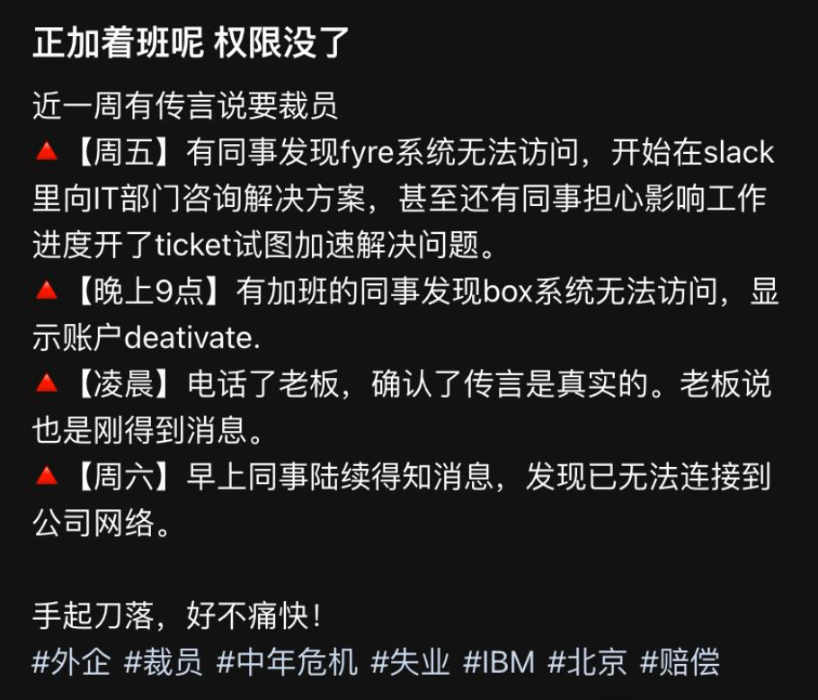 大型外企裁员往往有相当严格、紧张的流程,“电光火石之间就被裁了”。IBM在8月28日上午宣布裁掉在华仅剩的千余名研发人员,仅开了一场3分钟的线上会议。