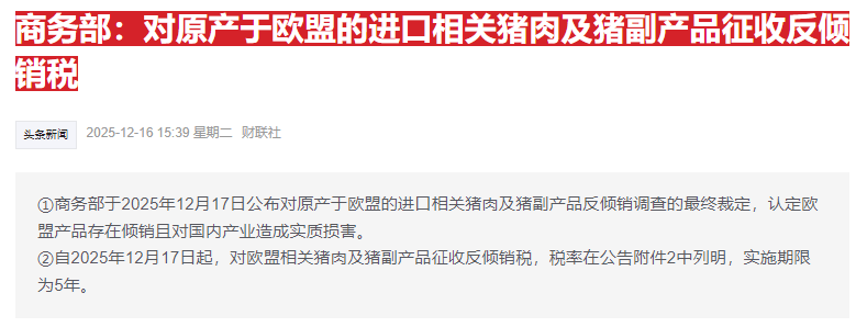 商务部:对原产于欧盟的进口相关猪肉及猪副产品征收反倾销税