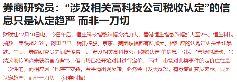 据财联社报道,今日午后,恒生科技指数跌幅突然加大,香港恒生指数跌幅扩大至2%。恒生科技指数一度跌超2.5%。阿里巴巴、腾讯控股、京东、美团跌幅都有所加大,相对应的认购证更是全线暴跌。午间,券商研究员之间流传着一则“涉及相关高科技公司税收认定”的信息,引发了市场的波动。