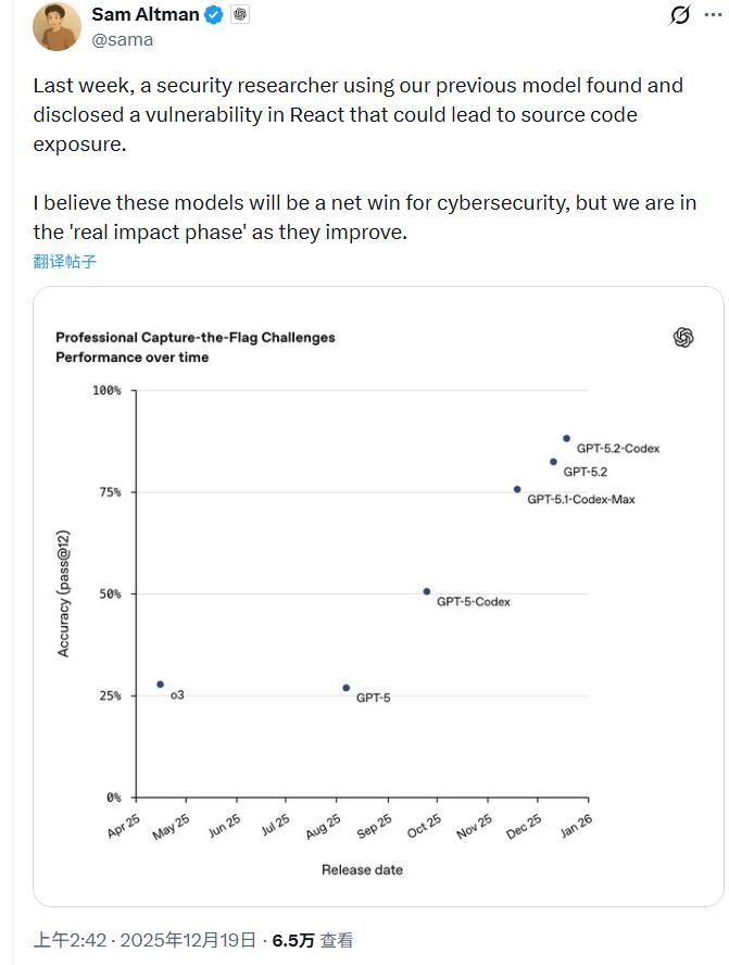 Altman在社交平台上披露:“上周,一名使用我们上一代(Codex)模型的安全研究人员发现并披露了React中可能导致源代码暴露的漏洞。我相信这些模型对网络安全将产生净收益,但随着它们的改进,我们正处于'真实影响阶段'。”