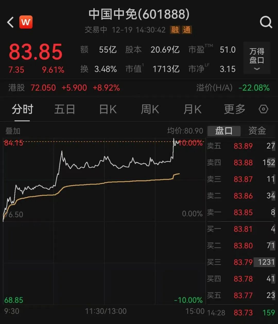 12月19日,中国中免盘中触及涨停,截至发稿,涨幅为9.61%,报83.85元/股;港股方面,大涨近9%。