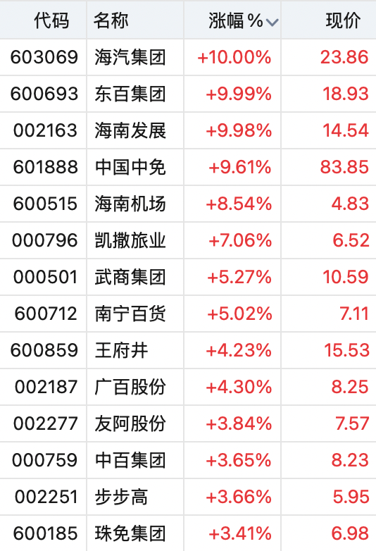 今日免税店板块集体拉升,截至发稿,海汽集团、东百集团、海南发展涨停,海南机场涨超8%。