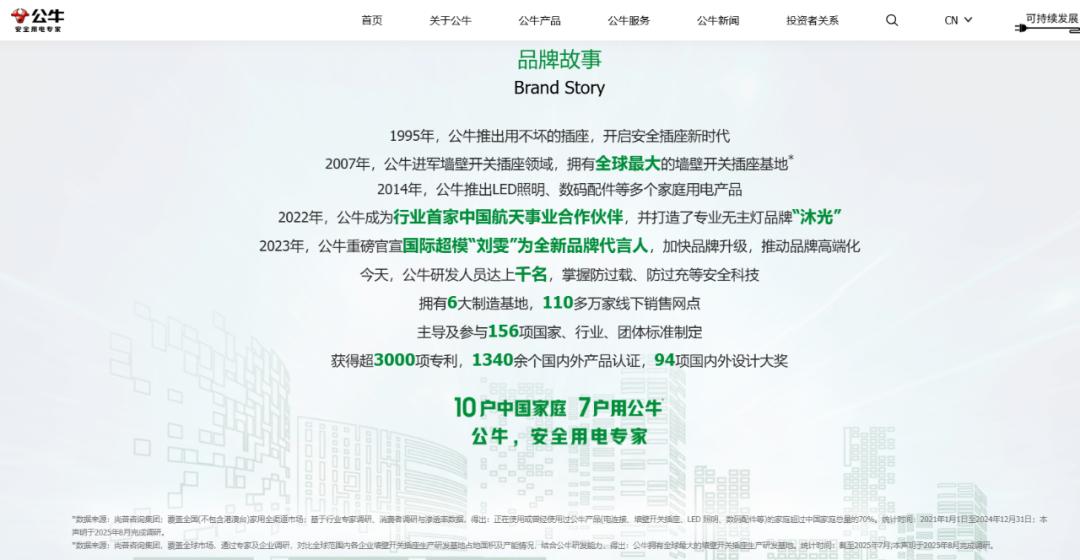 公牛集团官网首页显示,在广告语“10户中国家庭,7户用公牛”下方有两行小字,写着“数据来源:尚普咨询集团;覆盖全国(不包含港澳台)家用全渠道市场;基于行业专家调研、消费者调研与渗透率数据,得出:正在使用或曾经使用过公牛产品(电连接、墙壁开关插座、LED 照明、数码配件等)的家庭超过中国家庭总量的70%。统计时间:2021年1月1日至2024年12月31日;本声明于2025年8月完成调研。”