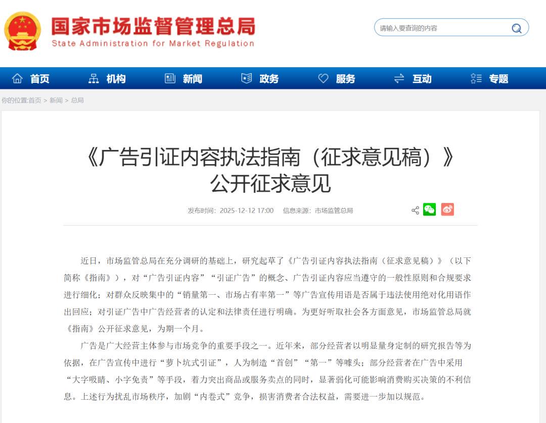 今年12月12日,市场监管总局就《广告引证内容执法指南(征求意见稿)》公开征求意见。