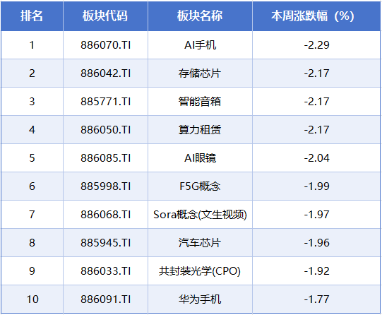本周排在跌幅榜前排的概念板块分别是AI手机、存储芯片、智能音箱、算力租赁、AI眼镜,累计跌幅分别为2.29%、2.17%、2.17%、2.17%、2.04%。