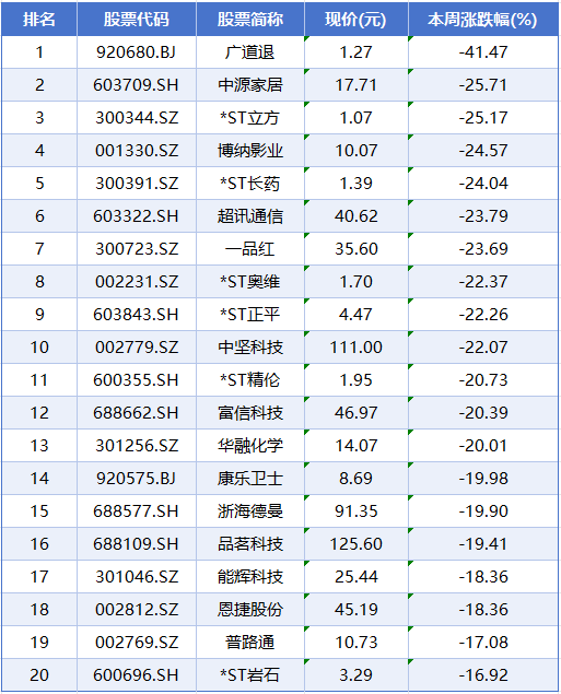 本周个股跌幅榜前五位分别是广道退、中源家居、*ST立方、博纳影业、*ST长药,累计跌幅分别为41.47%、25.71%、25.17%、24.57%、24.04%。