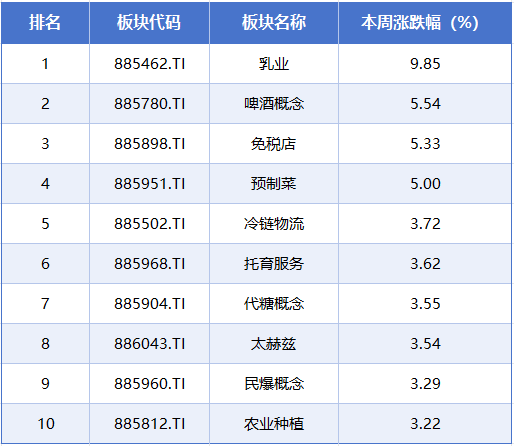 板块方面,本周涨幅居前的概念板块分别是乳业、啤酒概念、免税店、预制菜、冷链物流,累计涨幅分别为9.85%、5.54%、5.33%、5.00%、3.72%。