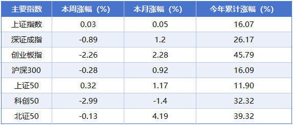本周(12月15日至12月19日),A股三大指数涨跌互现。截至周五收盘,上证指数累计上涨0.03%,深证成指累计下跌0.89%,创业板指累计下跌2.26%。