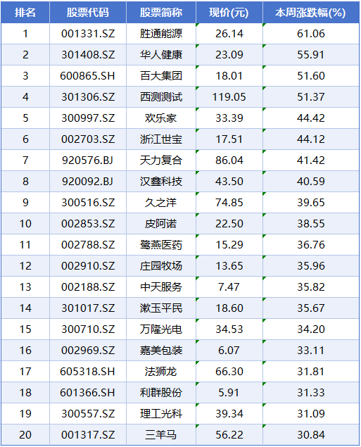 个股方面,本周个股涨幅榜前五位分别是胜通能源、华人健康、百大集团、西测测试、欢乐家,累计涨幅分别为61.06%、55.91%、51.60%、51.37%、44.42%。