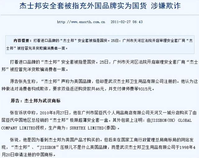 2010年-2011年,有消费者向广州市天河区法院起诉杰士邦冒充洋货欺骗消费者,涉嫌欺诈。当时还引来了职业打假人王海打假。这时人们才发现杰士邦压根不是什么英国品牌,而是武汉杰士邦卫生用品有限公司注册的中国商标。