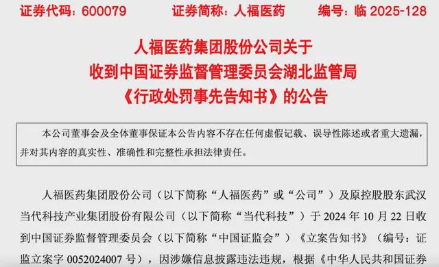 12月12日,证监局一纸《行政处罚事先告知书》揭示了人福医药及其原控股股东当代集团在2020年至2022年间,存在财务造假、资金占用、信披违规、财报重大遗漏等一系列令人触目惊心的信息披露违法违规行为,累计罚款高达3670万。