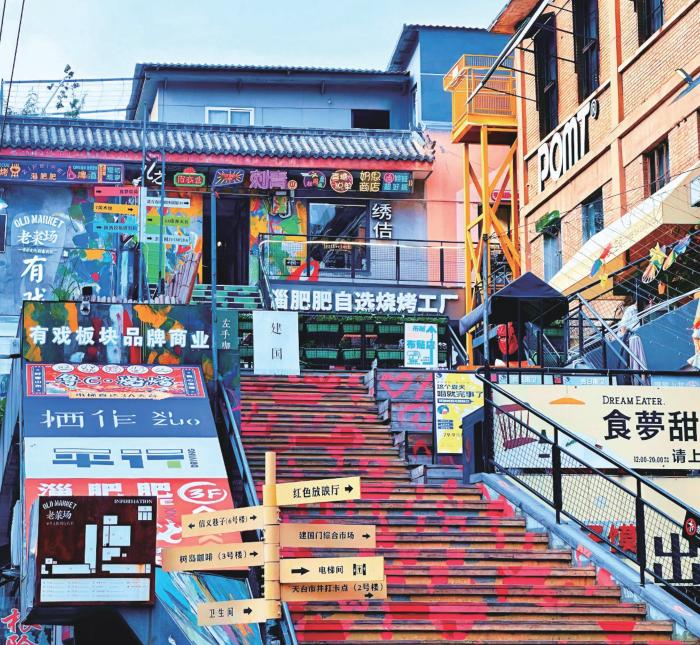 最为人称道的是其“共生”模式。改造没有拆毁一栋老房子,也没有赶走一个老商户。一楼菜市场功能被完整保留,小磨香油、新鲜肉铺等生活店铺依然在为周边居民服务。二楼以上则引入了小资咖啡、文创零售、特色酒吧等新业态。