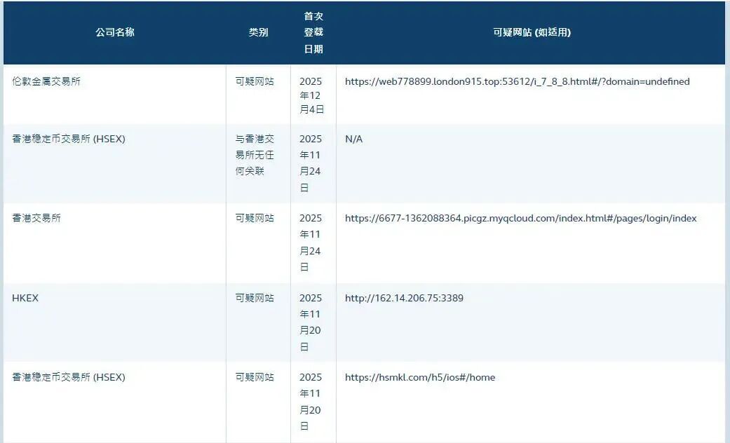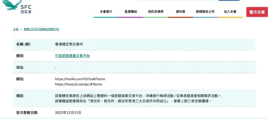 这份文件落款为“香港稳定币交易所市场监察部”。而记者注意到,香港证监会网站显示,12月15日,香港证监会将“香港稳定币交易所”列入可疑虚拟资产交易平台警示名单。香港证监会表示,该实体宣称是在上述网站上营运的一个虚拟资产交易平台,涉嫌进行无牌活动/从事虚拟资产相关欺诈活动。该实体虚假宣称其由“港交所、联交所、期交所香港三大交易所共同成立”,事实上跟三者并无关连。