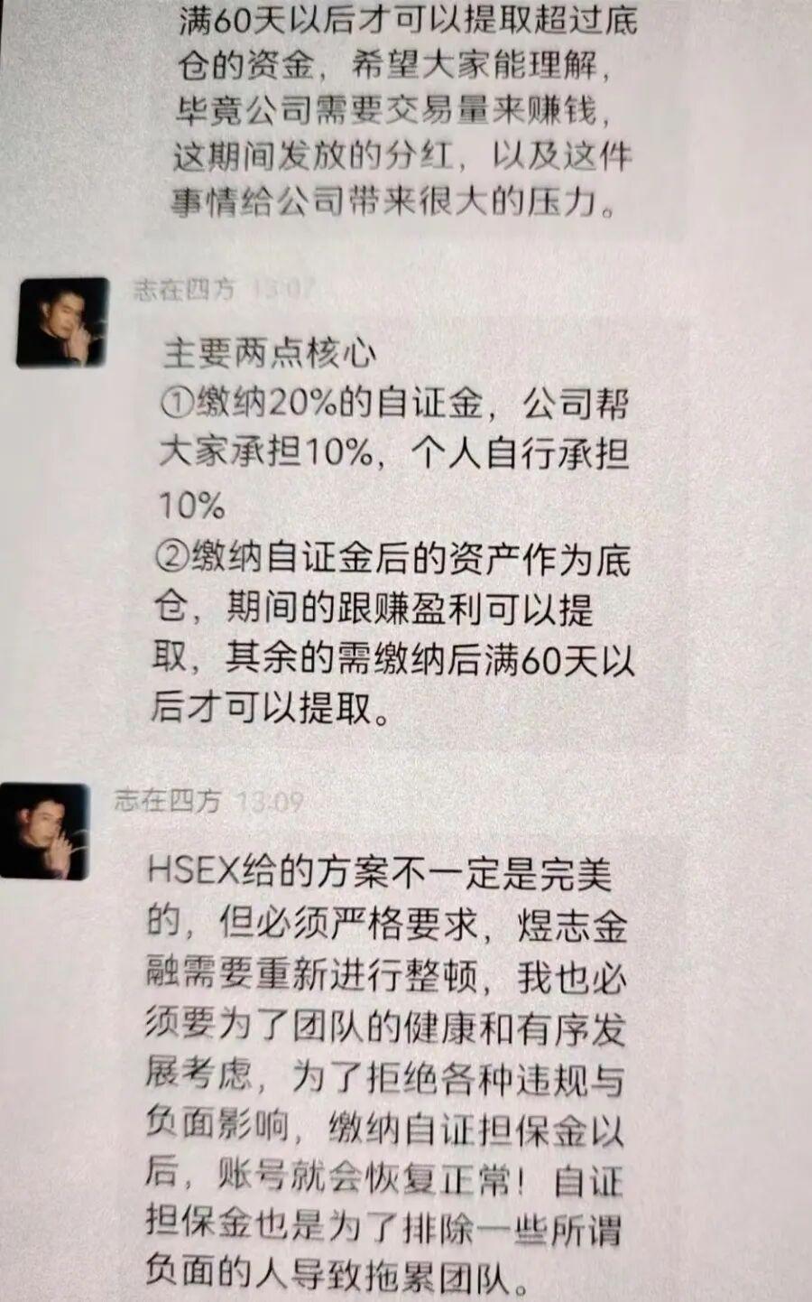 12月13日左右,一份落款为“HSEX交易所市场监察部”的文件在各投资群流传。文件声称,因发现煜志金融因涉嫌“洗售交易及虚假交易”等违规操作,要求所有关联账户缴存其总资产20%的资金作为“自证保证金”,并将提款手续费临时上调至30%,以表“合作诚意”。