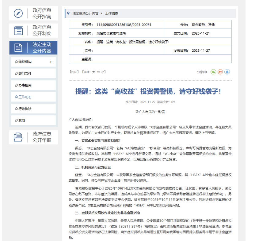 11月以来,广东省信宜市、高州市均发布了《致广大市民的一封信》提醒,个别机构或个人涉嫌以“X志金融有限公司”名义从事非法金融活动,存在较大风险隐患。