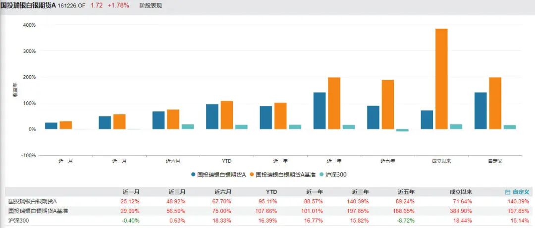 但是这只基金其实跟踪得并不好,收益率明显低于基准“上海期货交易所白银期货主力合约”。截至12月18日,“上海期货交易所白银期货主力合约”近1年收益率都翻倍了,“国投白银LOF”近1年收益率还只有88.57%。成立以来收益率更是跟基准相差甚远,“上海期货交易所白银期货主力合约”的收益率达到384.9%,而“国投白银LOF”只有71.64%。