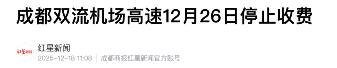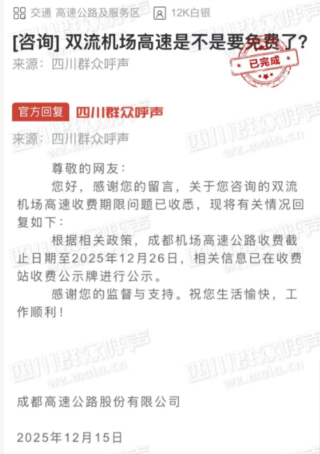 成都高速公路股份有限公司回复:“根据相关政策,成都机场高速公路收费截止日期至2025年12月26日,相关信息已在收费站公示牌进行公示。”