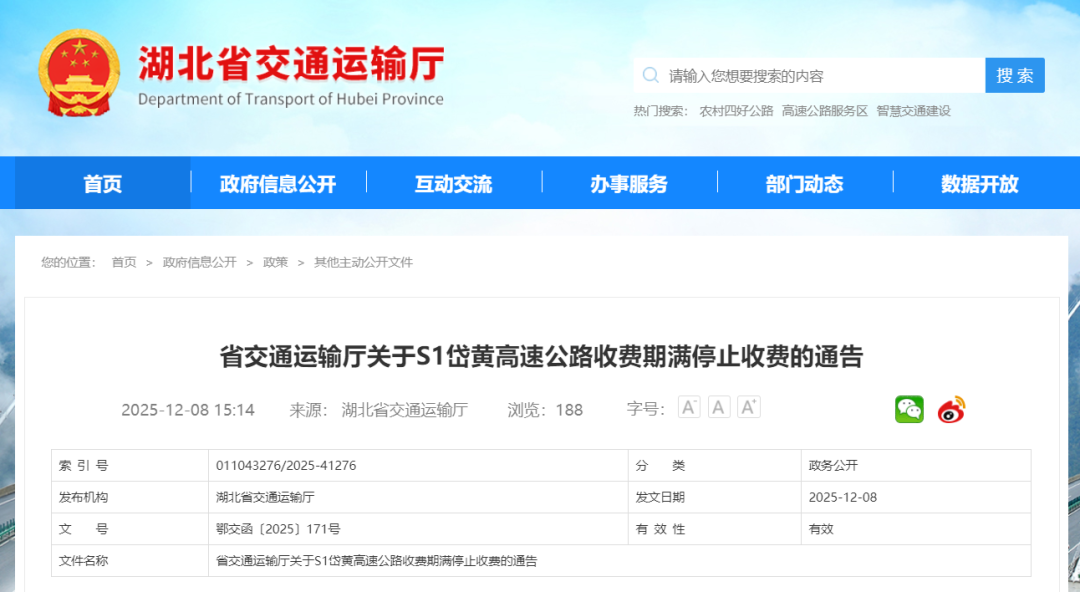 差不多同一时间,《湖北省交通运输厅关于S1岱黄高速公路收费期满停止收费的通告》显示:自2025年12月14日0时起,S1岱黄高速公路停止收费。