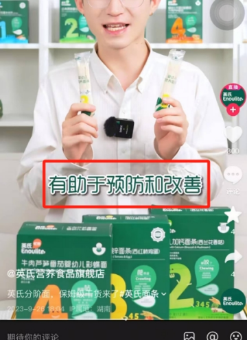 上面这个视频截图也是来自英氏控股的账号,视频中提到英氏一款面条“有助于预防和改善挑食和厌食”。有助于改善和预防某种症状/现象,亦属“蓝帽子”保健品才能说的广告词。