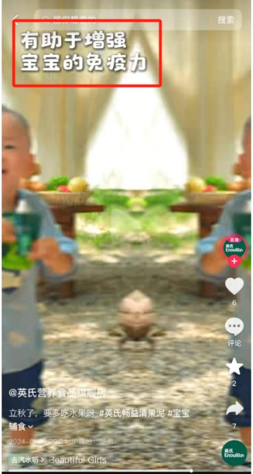 上面这个视频截图,来自英氏控股的官方账号。视频中明确提到了这款果泥“有助于增强宝宝的免疫力”,这是“蓝帽子”保健品才能说的宣传语,食品说了涉嫌违法违规。