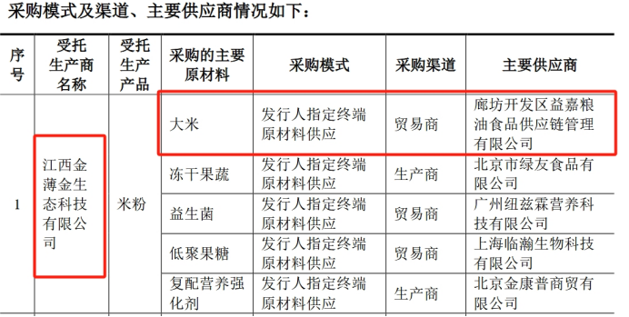涉及到米粉的受托生产商为江西金薄金,该公司的大米主要供应商为廊坊益嘉粮油。廊坊益嘉粮油并非是一家大米生产企业,而是一家贸易商,当然我们不能排除廊坊益嘉粮油为江西金薄金提供了真正的五常大米,或者英氏控股有其他“五常大米”收购渠道,毕竟贸易商在原产地收购大米也属于正常操作。