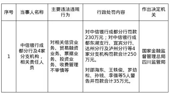 据国家金融监管总局四川监管局官网披露,2025年12月18日,中信银行成都分行因“对相关信贷业务、贸易融资业务、票据业务、投资业务、收费管理不审慎等”一系列主要违法违规行为,被处以230万元罚款。