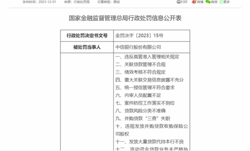 与罚单并行的,还有中信银行的金融腐败。