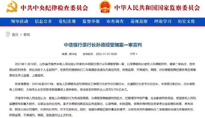就在上述天价罚单被开出的前半个多月,山东省济南市中级人民法院以受贿罪判处孙德顺死刑、缓期二年执行,剥夺政治权利终身,并处没收个人全部财产。