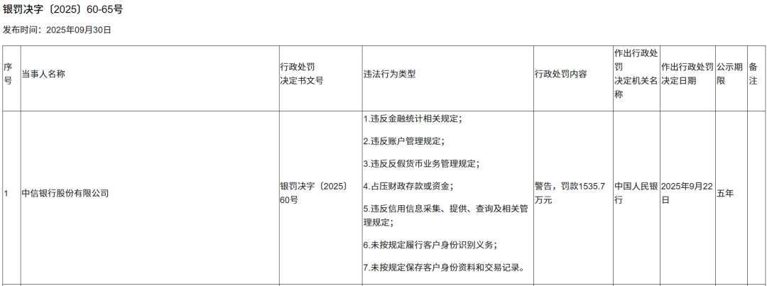 更值得注意的是,这只是中信银行在2025年收到的又一张罚单。