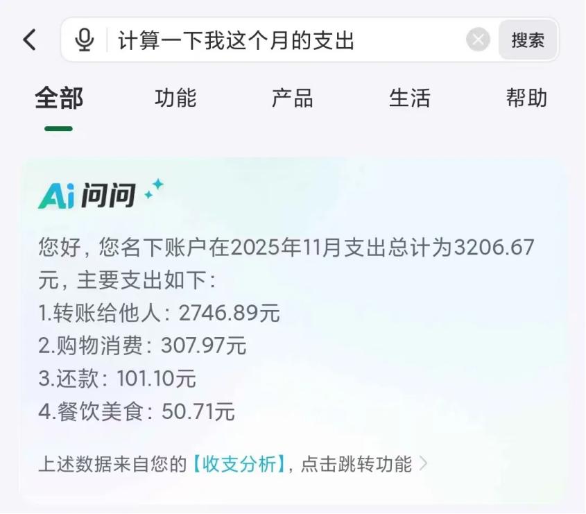 AI问问则打造了“一站式”搜索,你只需要输入“查我上个月的收入”“我的开户行是哪里”“查我去年的工资”等,就可以直接获得查询结果。