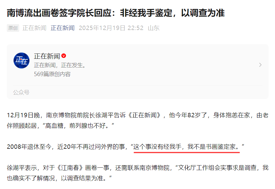 南京博物院这个事,几任院长都有责任,但最大的责任人是将《江南春》画卷拨交出去,并卖掉的原院长徐湖平。