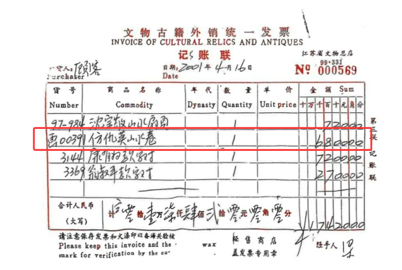 2001年4月,原江苏省文物总店以6800元出售这幅画时,徐湖平已经担任院长,并且是文物总店的法定代表人。