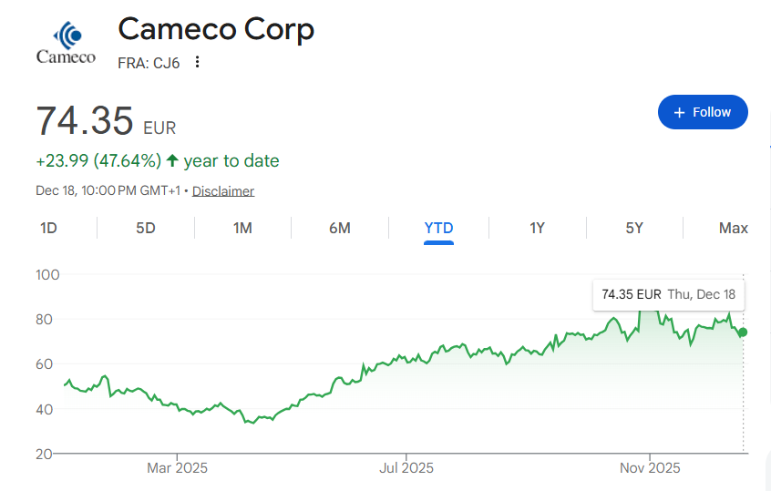 预期Cameco 2025财年盈利将同比增长96%,2026财年将同比增长55%。Cameco股价在过去六个月上涨了26.7%。