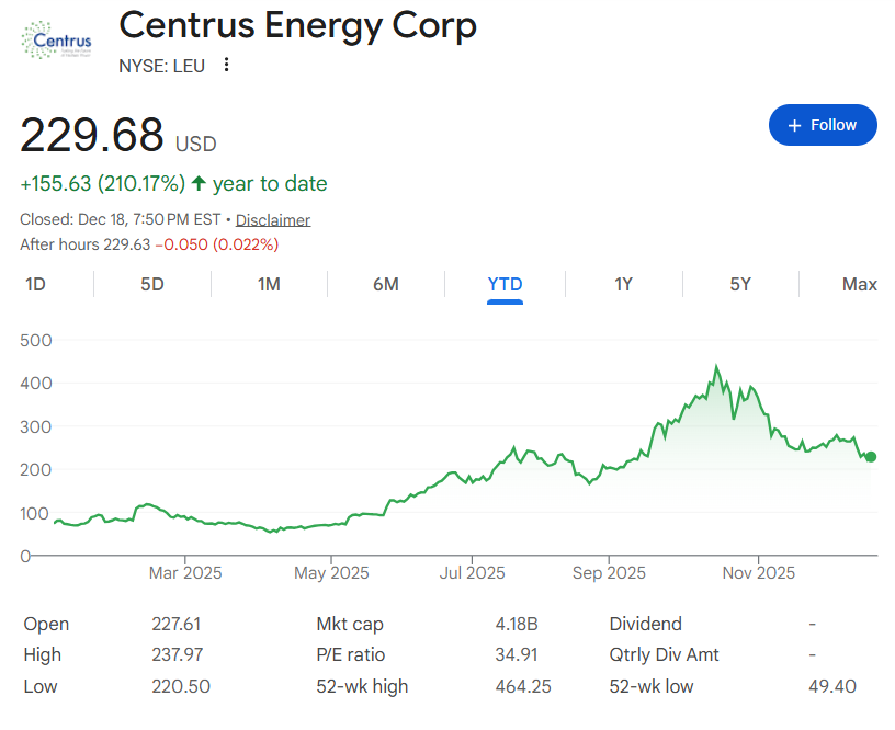 Centrus Energy 仍然是美国唯一一家完全采用美国技术制造离心机及相关设备的浓缩企业。这使其与那些使用海外制造的离心机技术、几乎控制着全球所有浓缩能力的外国国有企业截然不同。
