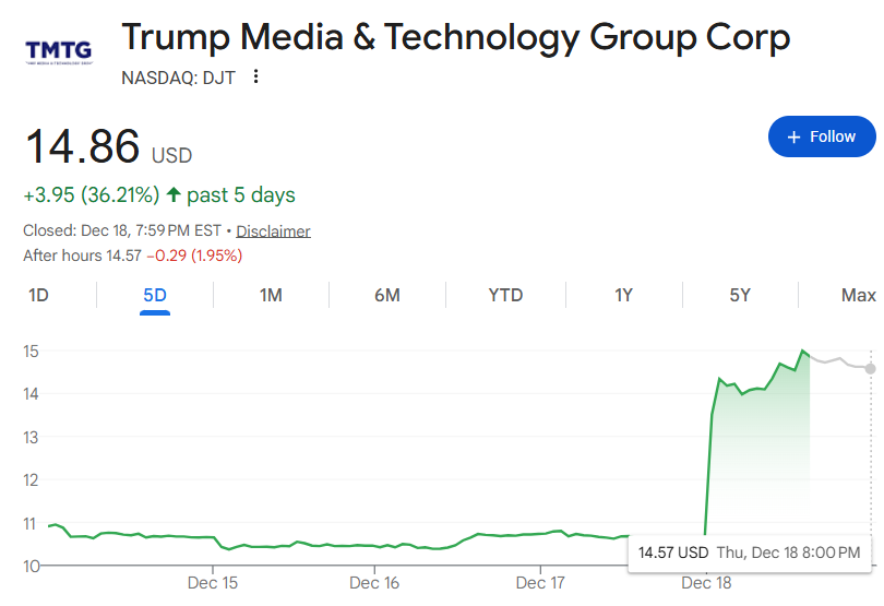 受此消息影响,特朗普媒体与技术集团的股价周四飙升,收盘暴涨41.93%,报14.86美元/股,从近一个月之前的低点处强势反弹,总市值41.61亿美元。