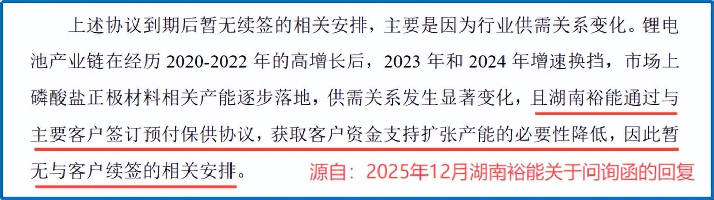 湖南裕能对此的解释是,随着2023-2024年行业增速换挡、产能逐步落地,供需关系发生变化,此类预付保供协议的必要性降低,因此双方未再续签。
