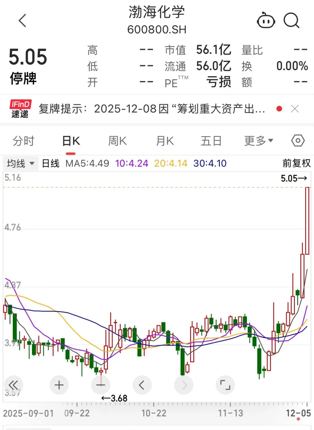 值得注意的是,在停牌前的最后一个交易日(12月5日),渤海化学股价突然飙涨,强势涨停,截至5日收盘,其股价在12月的5个交易日累计涨幅达22.87%,总市值升至56亿元。