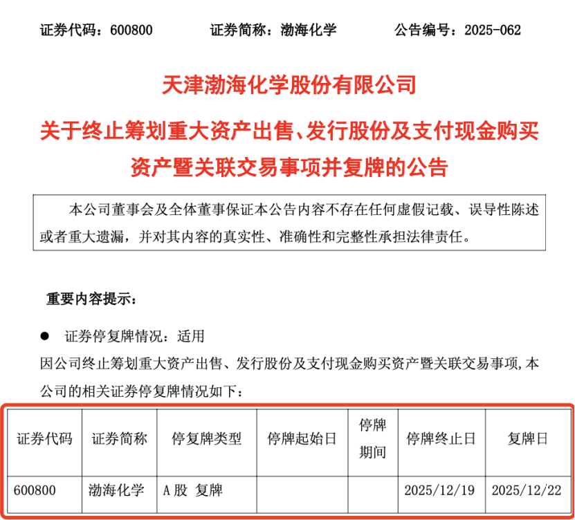 渤海化学12月19日晚间公告,宣布终止筹划出售渤海石化100%股权、收购泰达新材控制权的重大资产重组事项,核心原因系交易各方未能就方案核心条款达成一致。公司股票将于12月22日(星期一)开市起复牌。