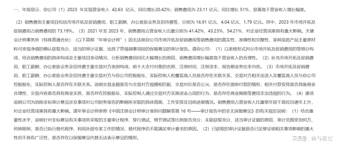 星空君发现,公司几乎每年都有年报问询函,而且每年的年报问询函里,都会事无巨细的质疑销售费用。