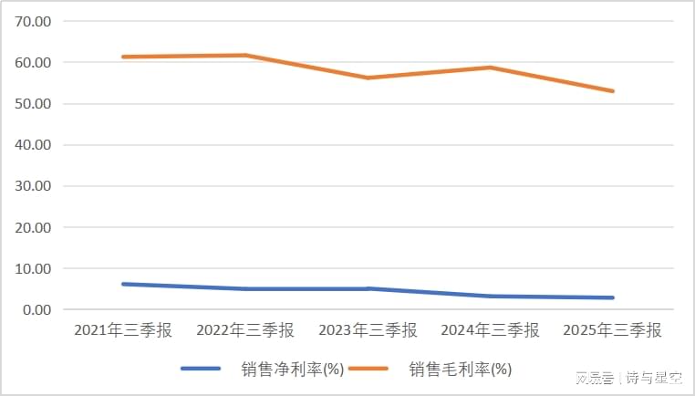 2025年三季报毛利率为52.91%,同比下降9.79个百分点;净利率为2.78%,同比下降11.44个百分点。这一盈利能力的下降趋势与历史数据一致,2024年全年净利率仅为0.96%,显示公司产品附加值不高,成本控制面临挑战。