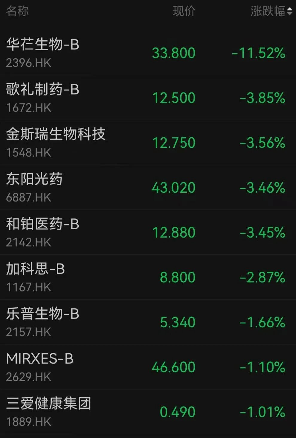 多只生物医药股走低,歌礼制药-B、金斯瑞生物科技、东阳光药、和铂医药-B均跌超3%。
