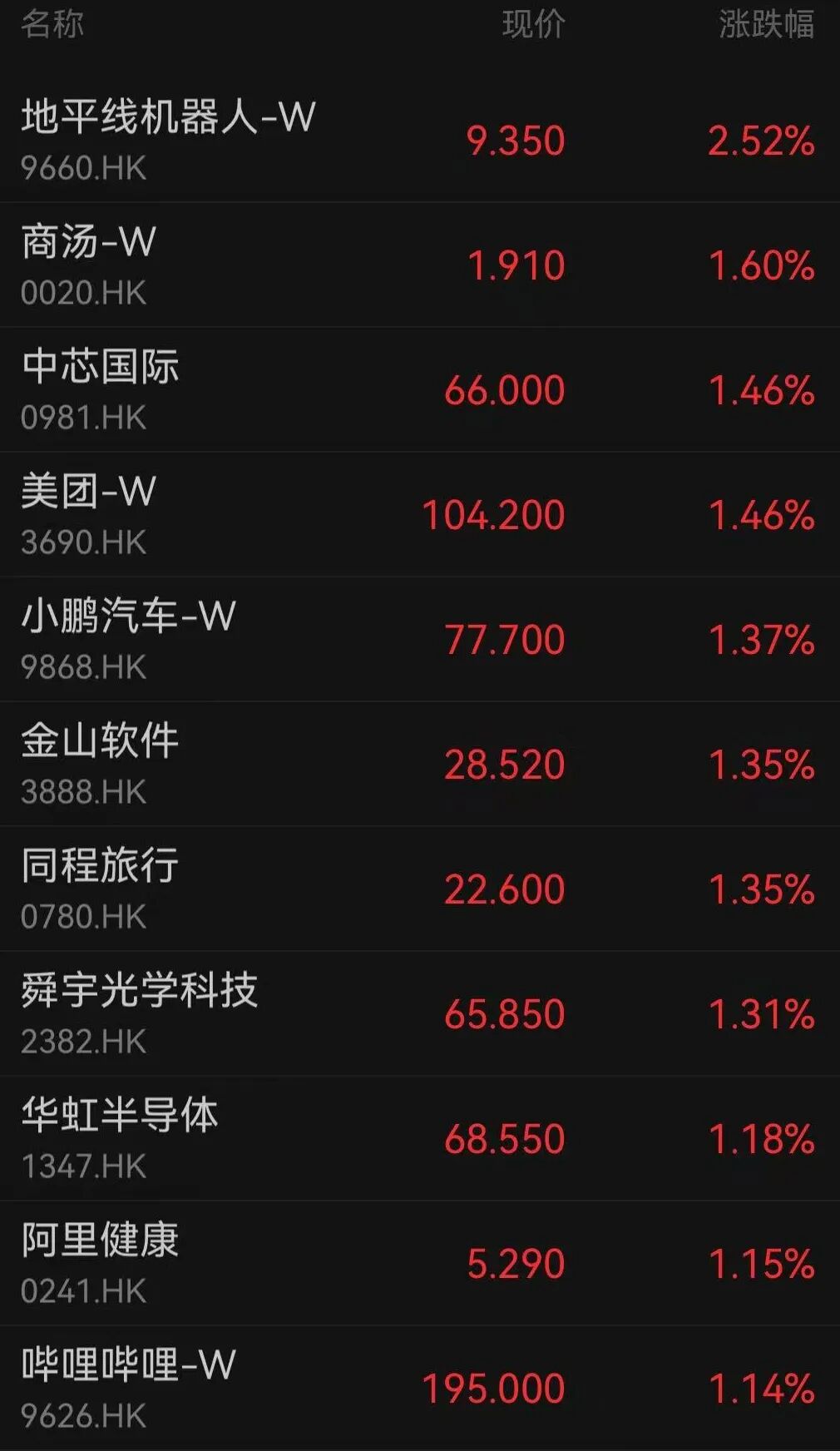 延续上周五涨势,科网股开盘普遍走强,地平线机器人涨逾2%,商汤、中芯国际、美团、小鹏汽车等纷纷上涨。