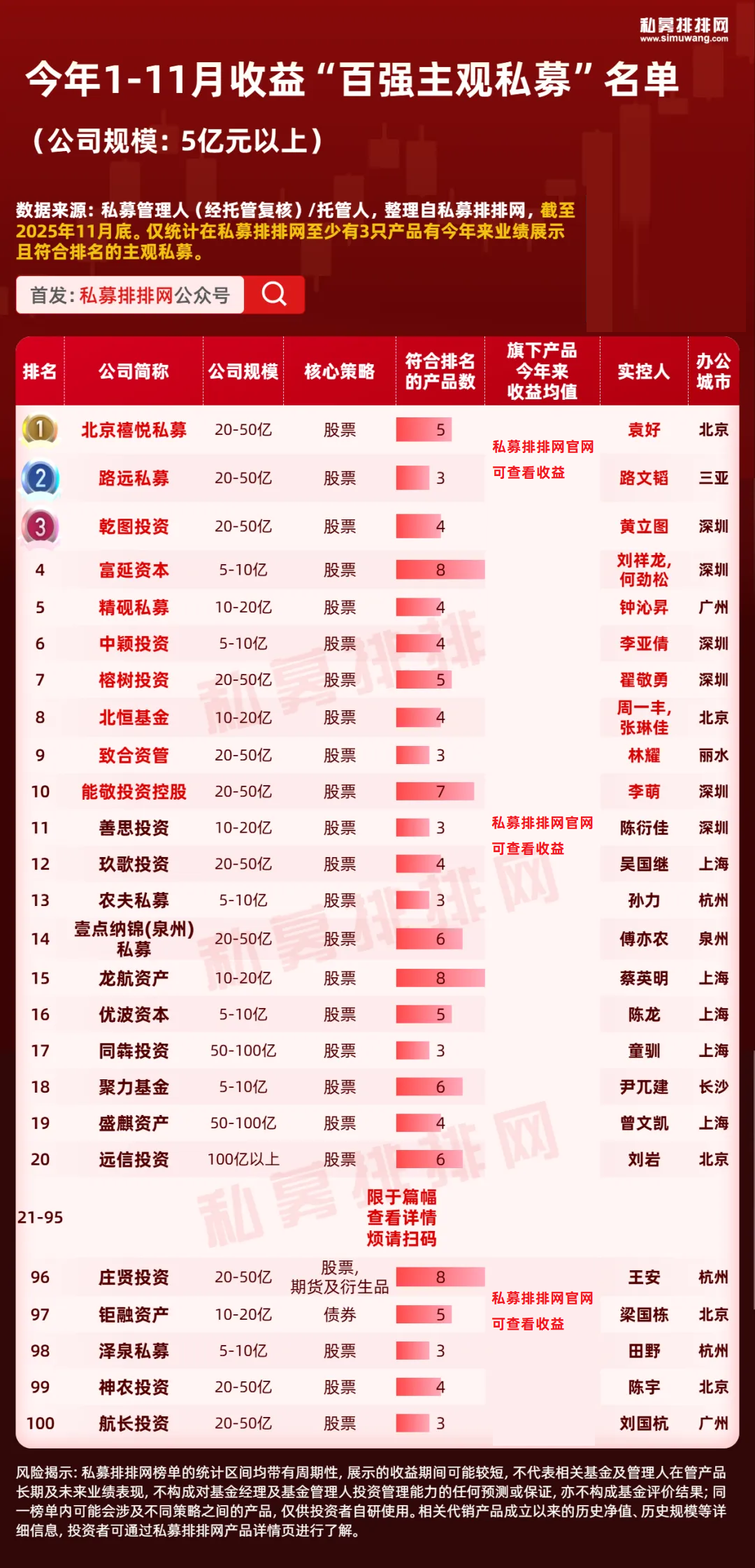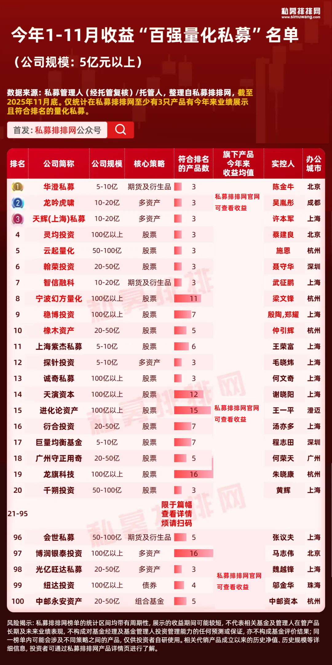 在这样的市场背景下,私募今年来收益整体表现亮眼,但也有一定分化。为了给读者提供一些参考,笔者以今年1-11月的收益为衡量标准,先是在5亿以上规模私募中梳理出了“百强量化私募”、“百强主观私募”;然后在20亿以下规模私募中梳理出了“小而美百强私募”。(符合统计的私募:至少有3只产品在私募排排网有今年来业绩展示且符合排名规则)
