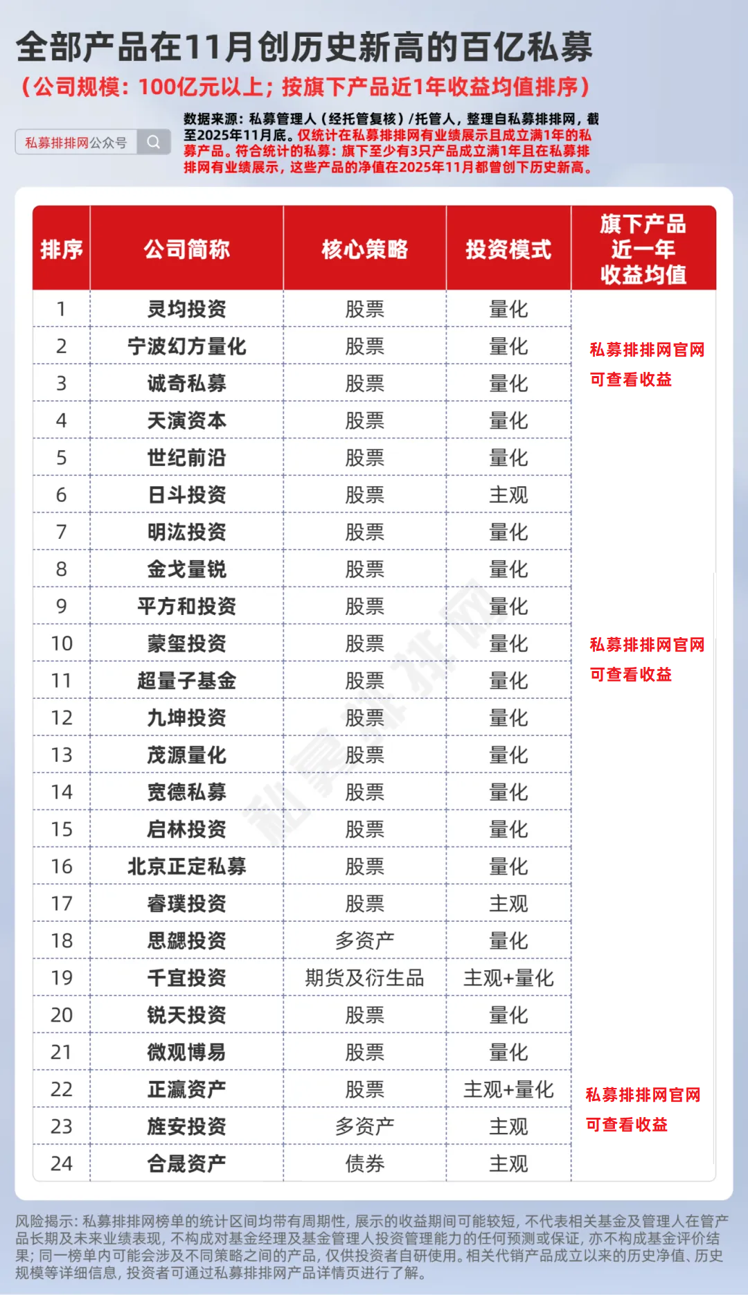 百亿私募:24家私募全部产品创新高!幻方、日斗、明汯排名居前!